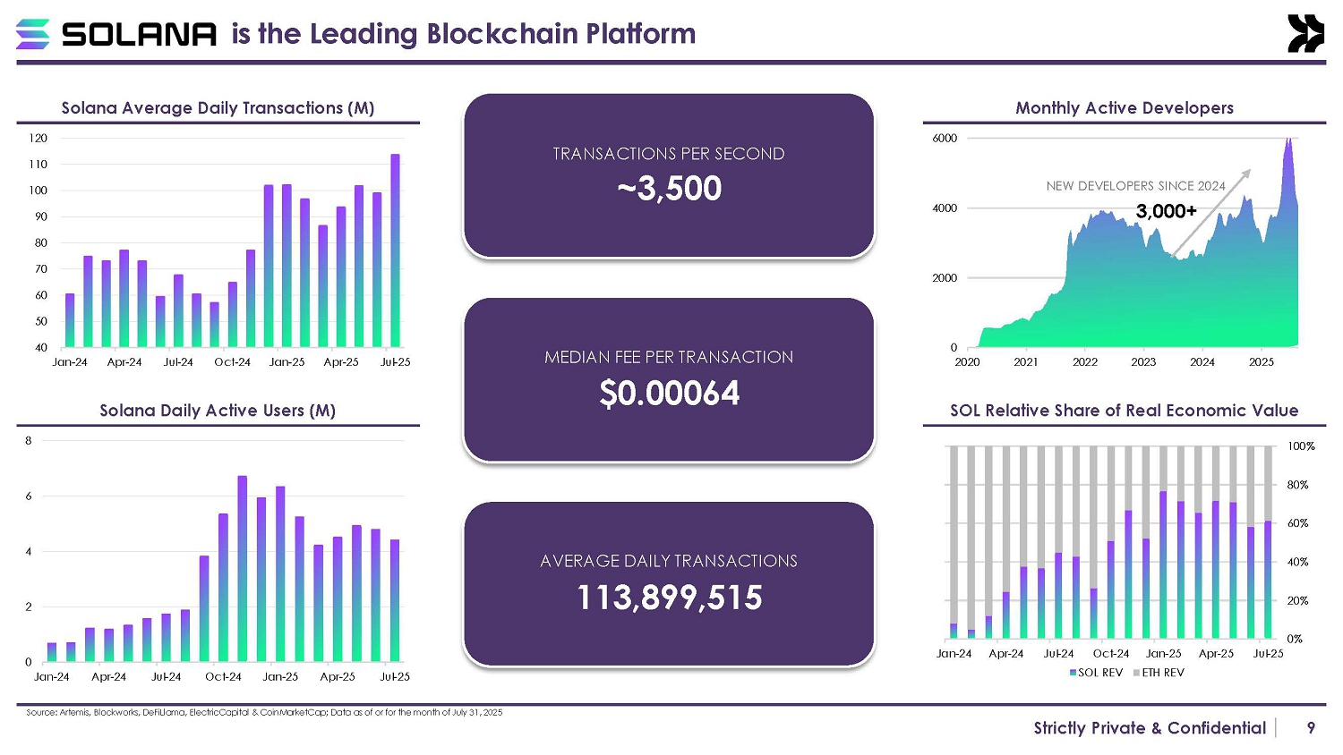 8 Strictly Private & Confidential ▪ ~3,500+ transactions per second with <400ms finality and consistent uptime ▪ <$0.01 fees per transaction that enables high volume activities The Fastest Blockchain ▪ 7,500+ new developers onboarded in 2024 ▪ 3.7M+ average daily active wallets with 23B+ transactions YTD The Most Widely Adopted Blockchain ▪ 5% of BTC market cap and 21% of ETH market cap ▪ 7% native staking yield with deflationary fee burning mechanism Financially Productive Asset with Asymmetric Upside ▪ Tokenized Fund by BlackRock, Apollo, Franklin Templeton and more ▪ Payment rails adoption by PayPal and Stripe Utilized by Blue - Chip Financial Institutions : Internet Capital Markets Sources: Blockworks Research, Electric Capital Crypto Developer Report