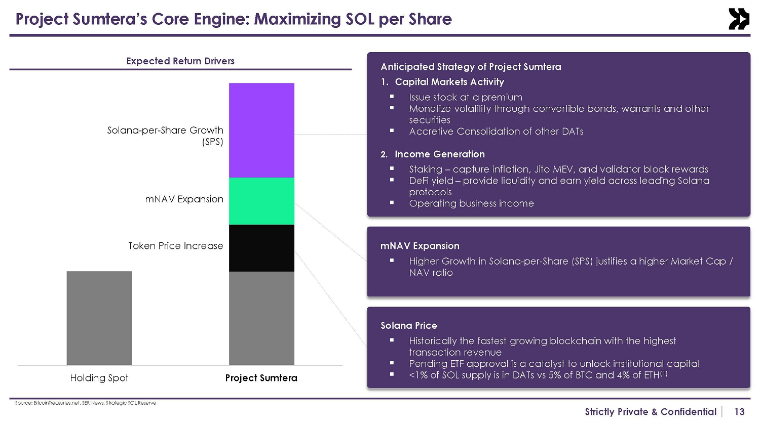 16 Strictly Private & Confidential Attractive Entry Point Company $13.55 $7.29 $7.23 $16.02 ~$6.88 Current Share Price $1,419M $161M $681M $630M ~$560M Pro Forma Market Cap - 420,706 2,000,518 1,831,011 ~2,500,000 # SOL Owned $693M $84M $400M $491M ~$500M $ SOL Owned 2.0x 1.9x 1.7x 1.3x ~0.9x Implied mNAV ~0.9x 1.7x 1.9x 2.0x 1.3x Project Sumtera Note: Project Sumtera fully diluted mNAV at deal price of $6.88 Source: Implied mNAV is calculated by dividing each company‘s market capitalization by the value of its Solana holdings, base d o n an SOL price of $200 for Sumtera. SOL Value reflects either reported holdings or projected SOL purchases assuming full use of capital raised. Market capitalizations are approximated using current share prices and assumed fully dil ute d shares outstanding. Dilution and SOL data were gathered from company filings, SEC disclosures, and financial databases as of August 29, 2025. These metrics are intended for comparative and illustrative analysis only and do not represe nt valuation guidance or investment recommendations
