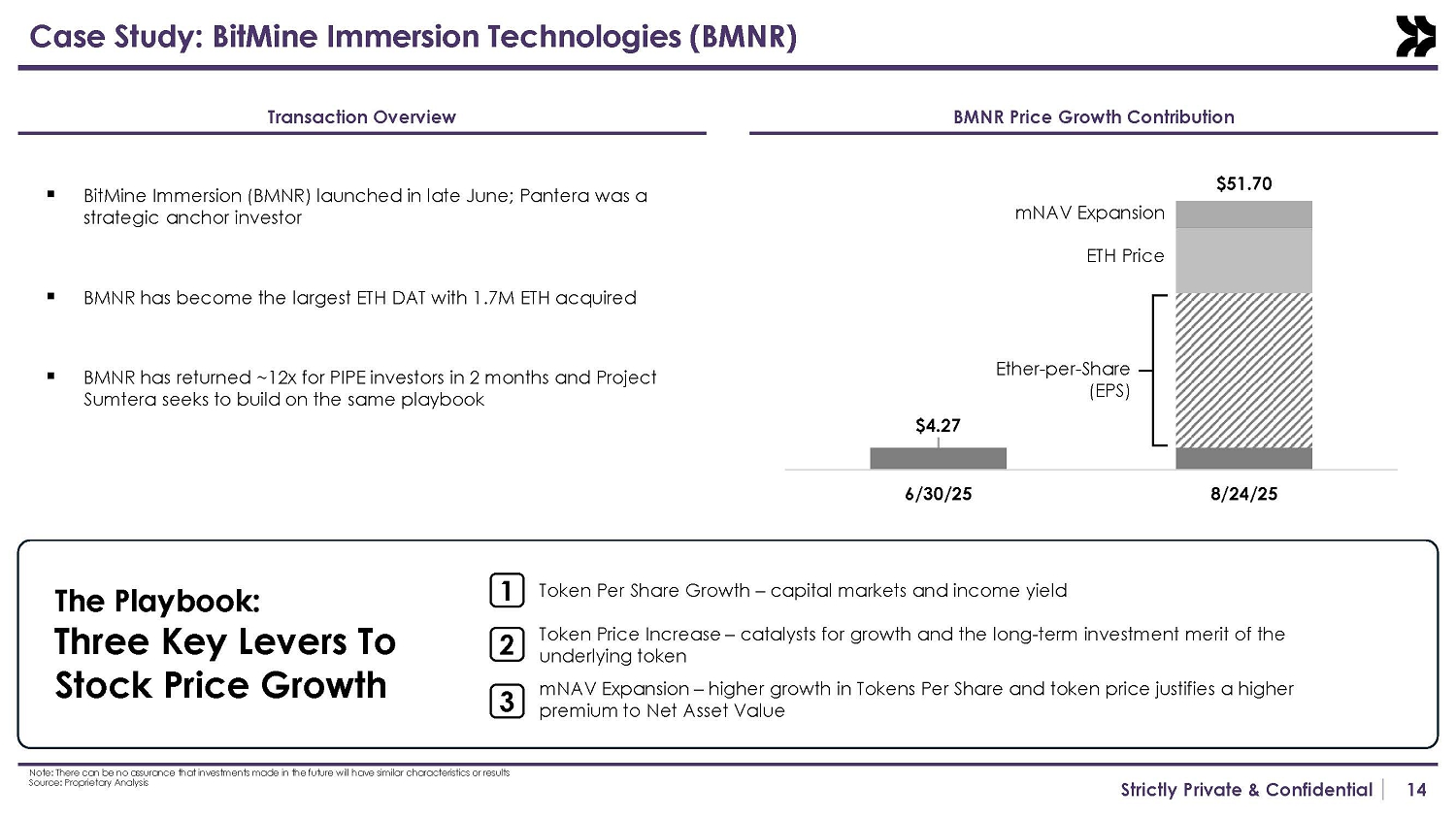 14 Strictly Private & Confidential Case Study: BitMine Immersion Technologies (BMNR) ▪ BitMine Immersion (BMNR) launched in late June; Pantera was a strategic anchor investor ▪ BMNR has become the largest ETH DAT with 1.7M ETH acquired ▪ BMNR has returned ~12x for PIPE investors in 2 months and Project Sumtera seeks to build on the same playbook $4.27 $51.70 6/30/25 8/24/25 mNAV Expansion ETH Price Ether - per - Share (EPS) The Playbook: Three Key Levers To Stock Price Growth 1 2 3 Token Per Share Growth – capital markets and income yield Token Price Increase – catalysts for growth and the long - term investment merit of the underlying token mNAV Expansion – higher growth in Tokens Per Share and token price justifies a higher premium to Net Asset Value Note: There can be no assurance that investments made in the future will have similar characteristics or results Source: Proprietary Analysis BMNR Price Growth Contribution Transaction Overview