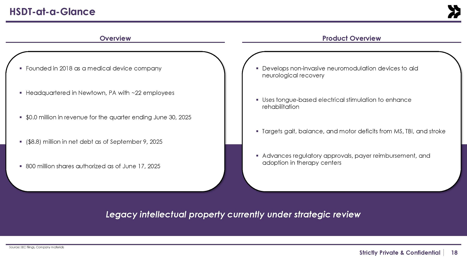18 Strictly Private & Confidential HSDT - at - a - Glance Overview Product Overview ▪ Founded in 2018 as a medical device company ▪ Headquartered in Newtown, PA with ~22 employees ▪ $0.0 million in revenue for the quarter ending June 30, 2025 ▪ ($8.8) million in net debt as of September 9, 2025 ▪ 800 million shares authorized as of June 17, 2025 ▪ Develops non - invasive neuromodulation devices to aid neurological recovery ▪ Uses tongue - based electrical stimulation to enhance rehabilitation ▪ Targets gait, balance, and motor deficits from MS, TBI, and stroke ▪ Advances regulatory approvals, payer reimbursement, and adoption in therapy centers Legacy intellectual property currently under strategic review Source: SEC filings, Company materials